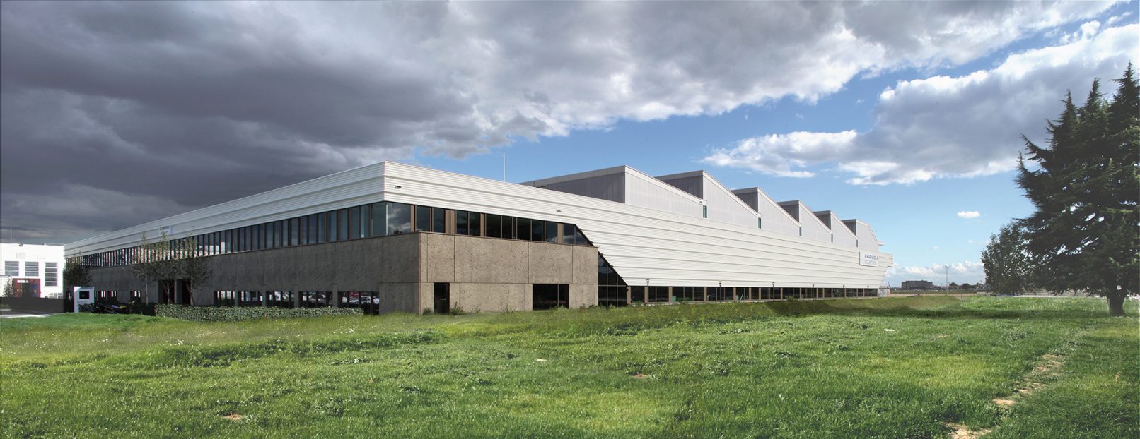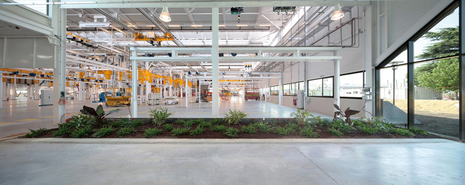La volumétrie compacte du Pôle Industriel Moteurs est liée aux différentes étapes et procédures rencontrées lors de la maintenance d’un turbo-réacteur. Le bâtiment n’est pas un simple abri pour activités industrielles mais une partie intégrante du process qui s’y déroule. La façade de la halle de maintenance déploie une métaphore de l’envol : un corps métallique en bardage blanc dont la forme évoque la section d’une aile, flotte au-dessus d’une base en béton matricé noir symbolisant des rochers. Ces éléments telluriques sont enchâssés dans un talus engazonné qu’ils semblent perforer.