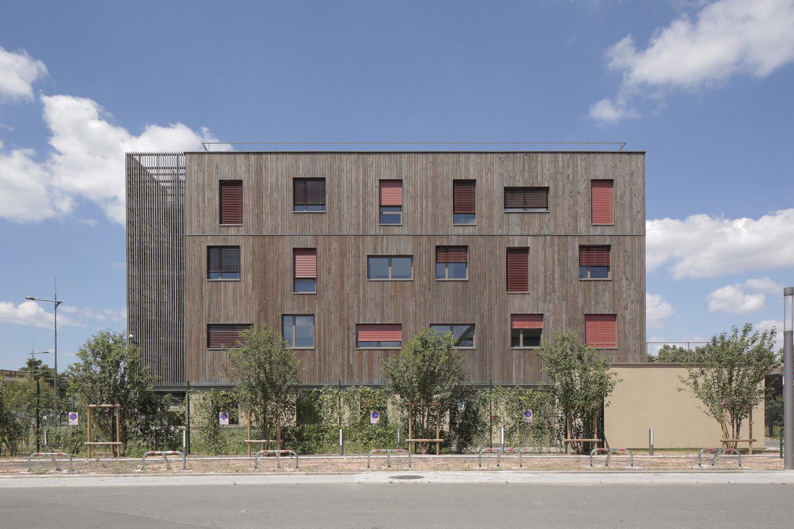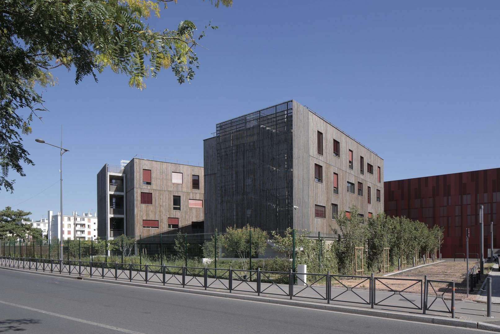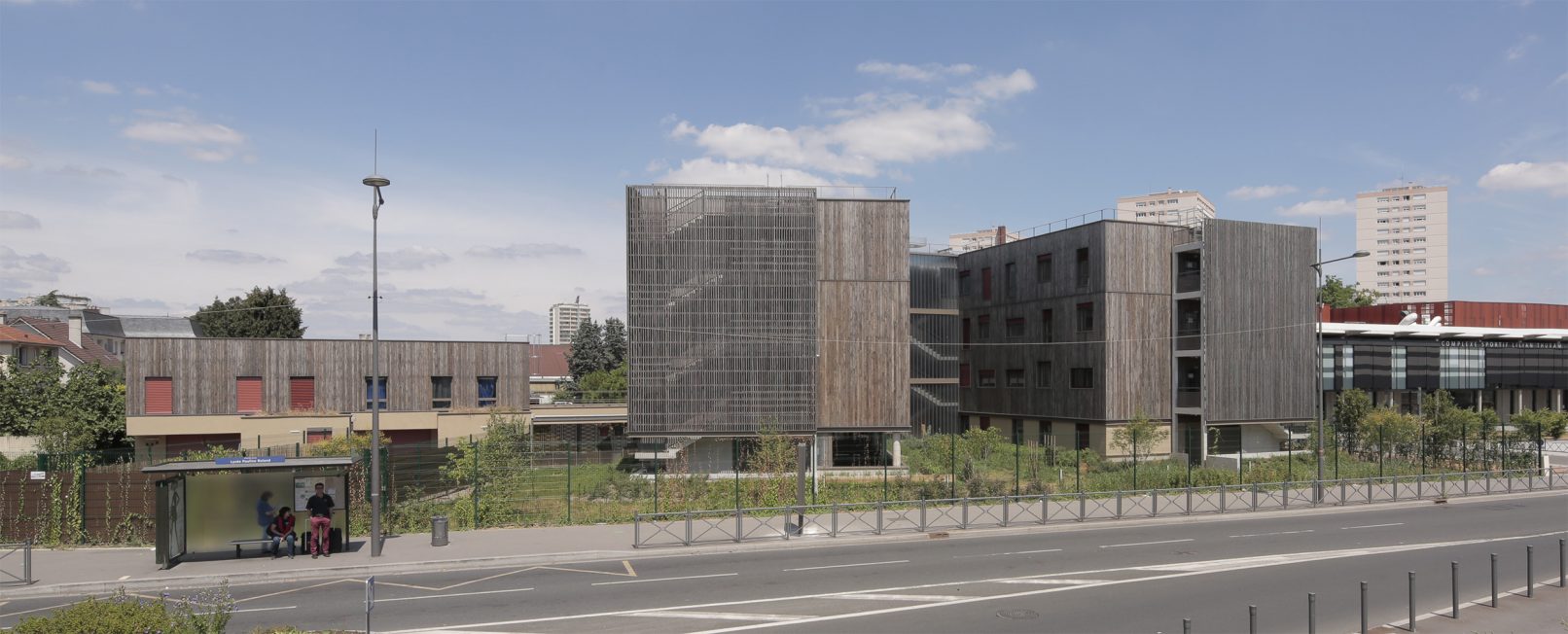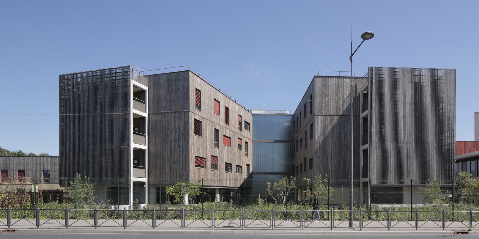 Situé à la croisée de deux axes majeurs : l’avenue du Général de Gaulle et le boulevard Jean Mermoz, l’internat s’inscrit à l’articulation des communes de Chevilly-Larue et de l’Haÿ-les-Roses. Il se replie sur deux ailes reliées par un volume longitudinal abritant les services communs. Les chambres sont organisées en sept unités de dix, assurant ainsi une flexibilité d’organisation. Un soubassement minéral assoit le volume, surmonté de trois niveaux revêtus de bardage de bois naturellement durable (douglas non traité) imprégné d’une lasure de teinte grise afin d’anticiper le grisaillement naturel du bois.