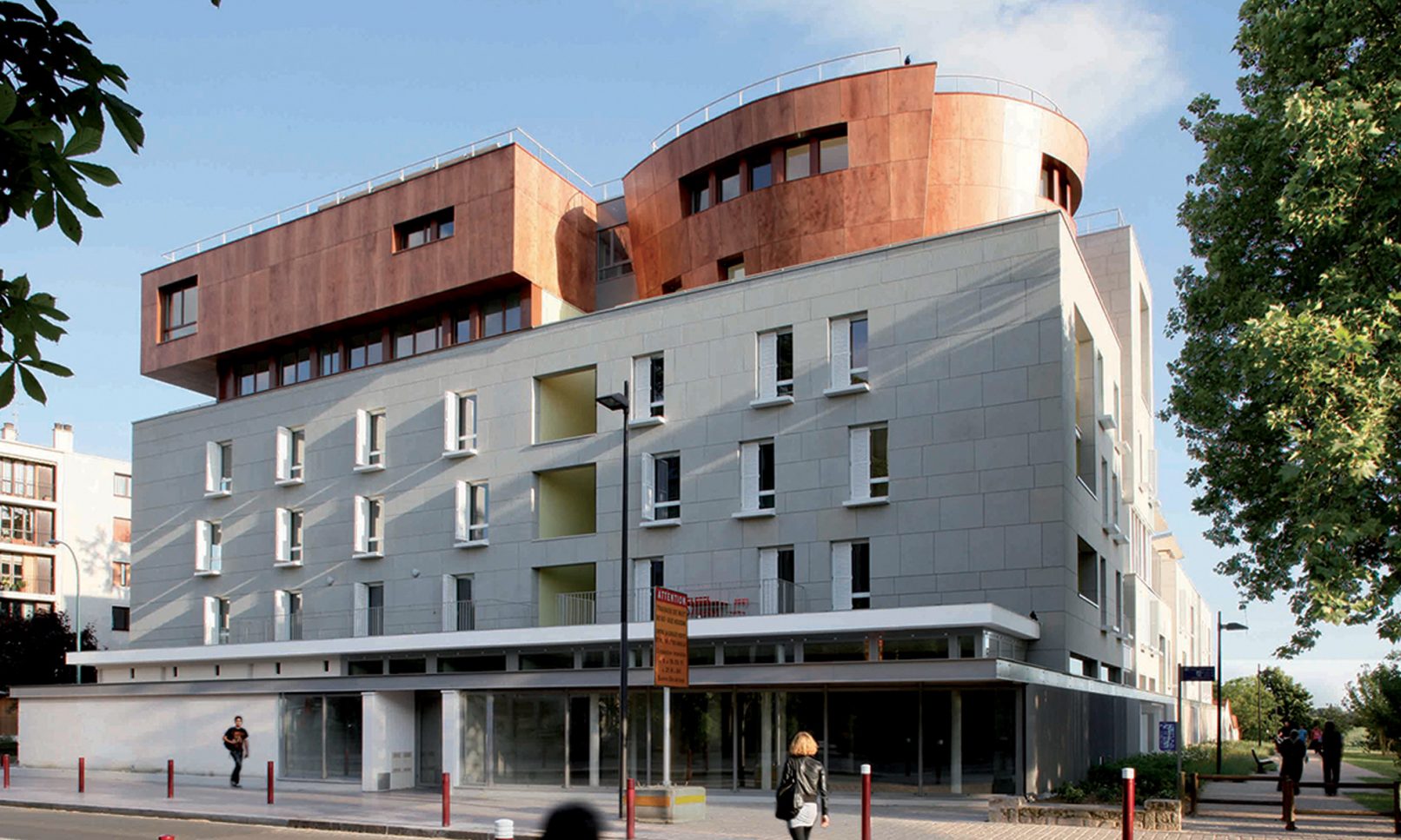 Occupant les trois côtés d’une grande parcelle à la sortie de la ville de Sceaux. au Sud de Paris, l’immeuble est un objet hybride, multiple. Il possède une façade rue Houdan menant directement au centre-ville. Il comprend différents types de construction : plot, immeuble et maison individuelle, unifiés par un long soubassement, jouant sur le plein et le creux, les ruptures et la complémentarité d’échelle. L’ensemble construit apparaît comme une œuvre contemporaine monumentale, posée sur le socle d’un immeuble voulu plus neutre, dans une commune peu habituée aux grands gestes architecturaux.