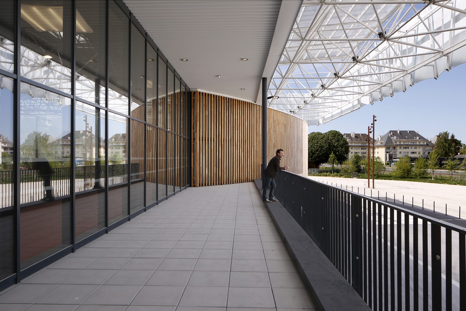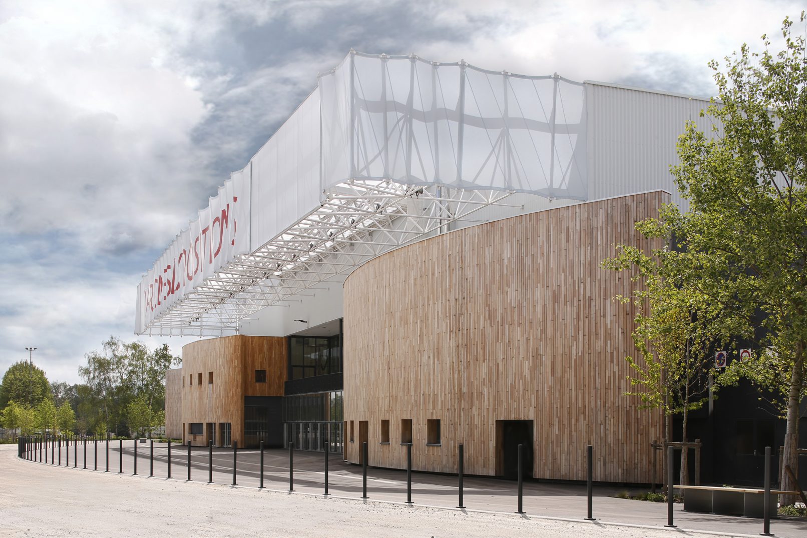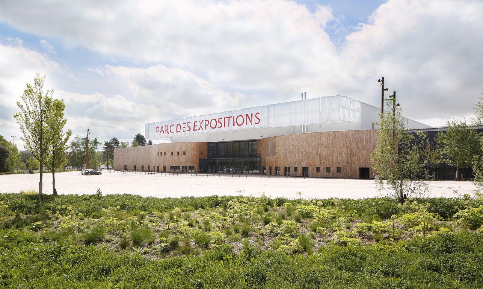 À la suite de l’effondrement du hall 2 du Parc des Expositions de Caen, provoqué par l’épisode neigeux du mois de mars 2013, des solutions architecturales rapides ont été proposées afin de garantir une reconstruction pérenne, rapide et la moins coûteuse possible. La façade principale est habillée par un volume souple revêtu d’un bardage de bois vertical. Un nouvel accueil et une terrasse sont créés. La surface d’exposition accrue permet une meilleure utilisation de l’espace, et cela dès les Jeux équestres Mondiaux de l’été 2014.